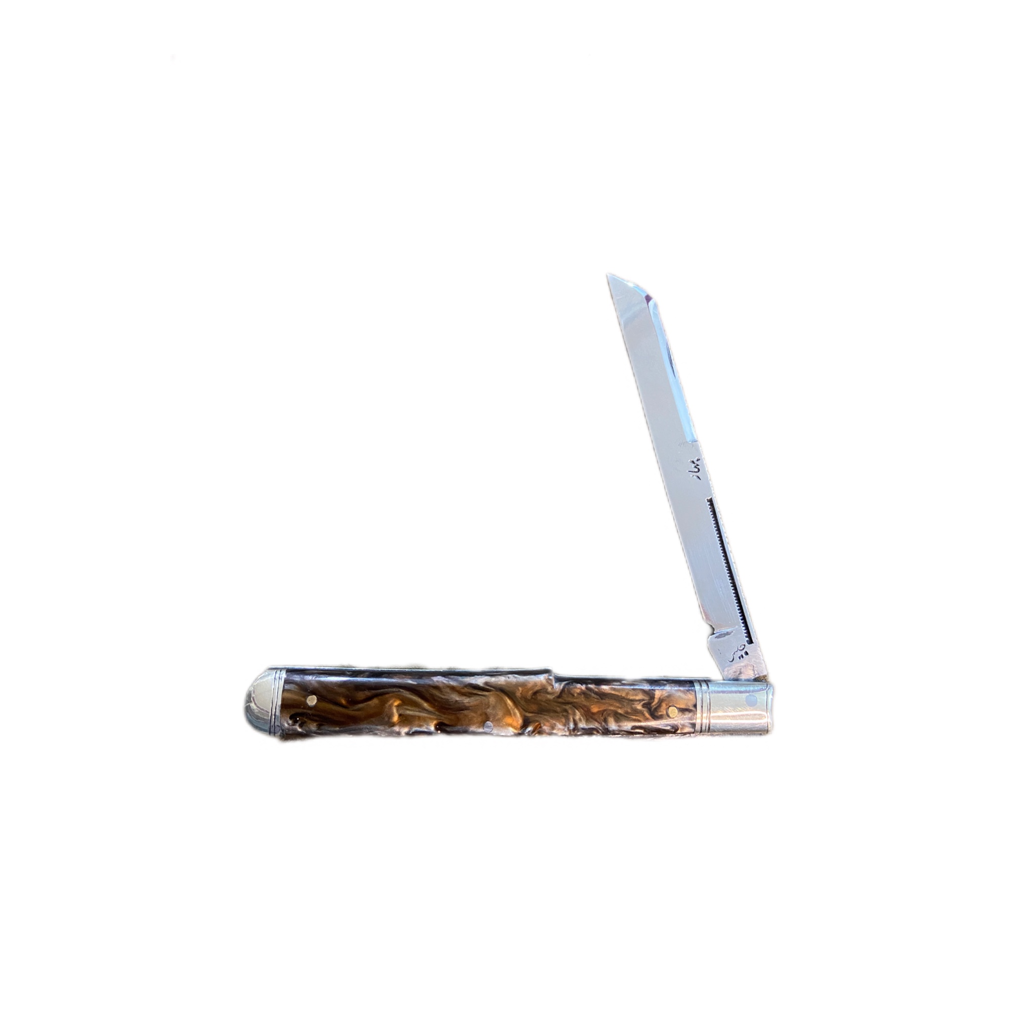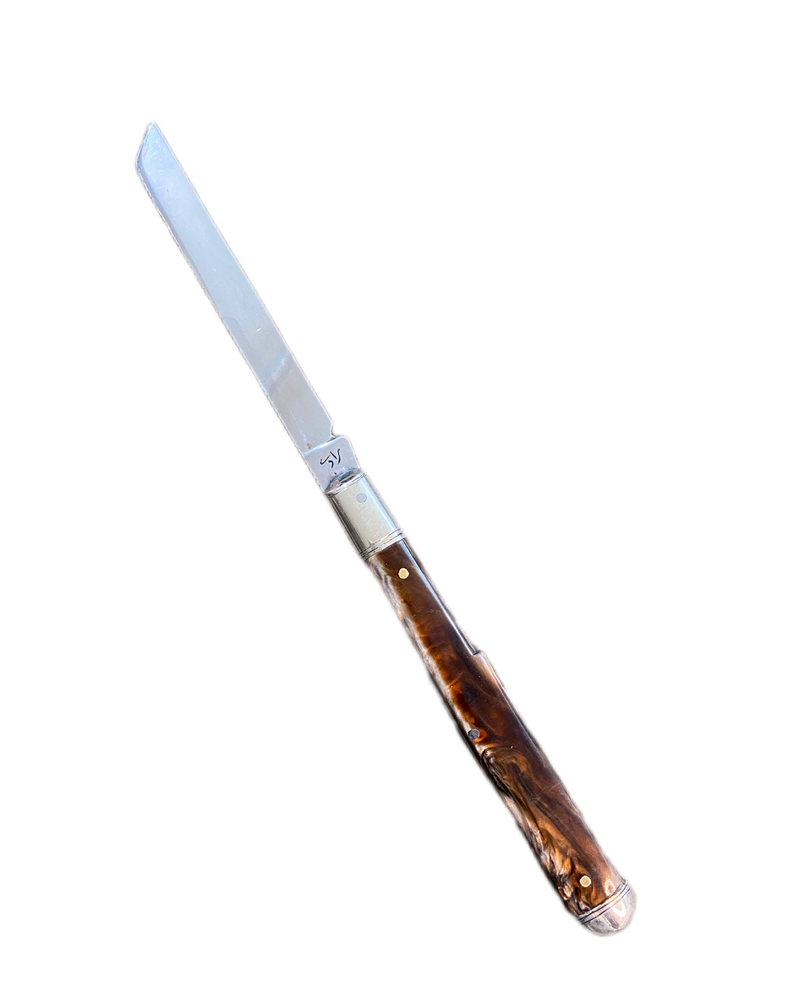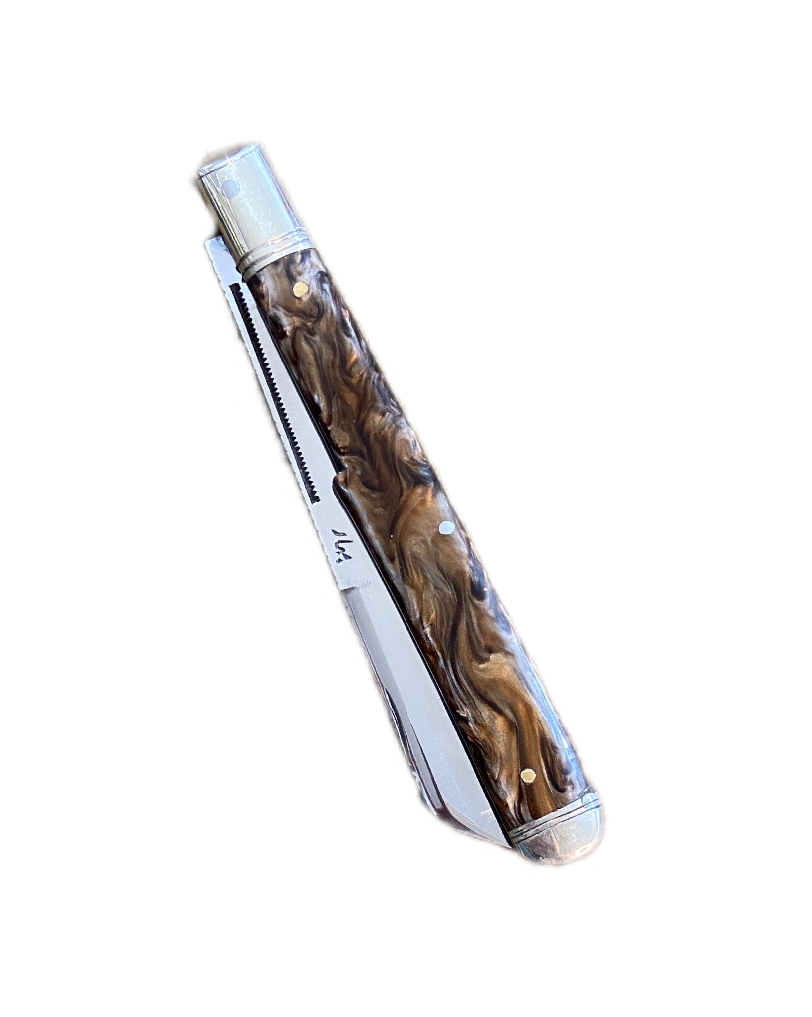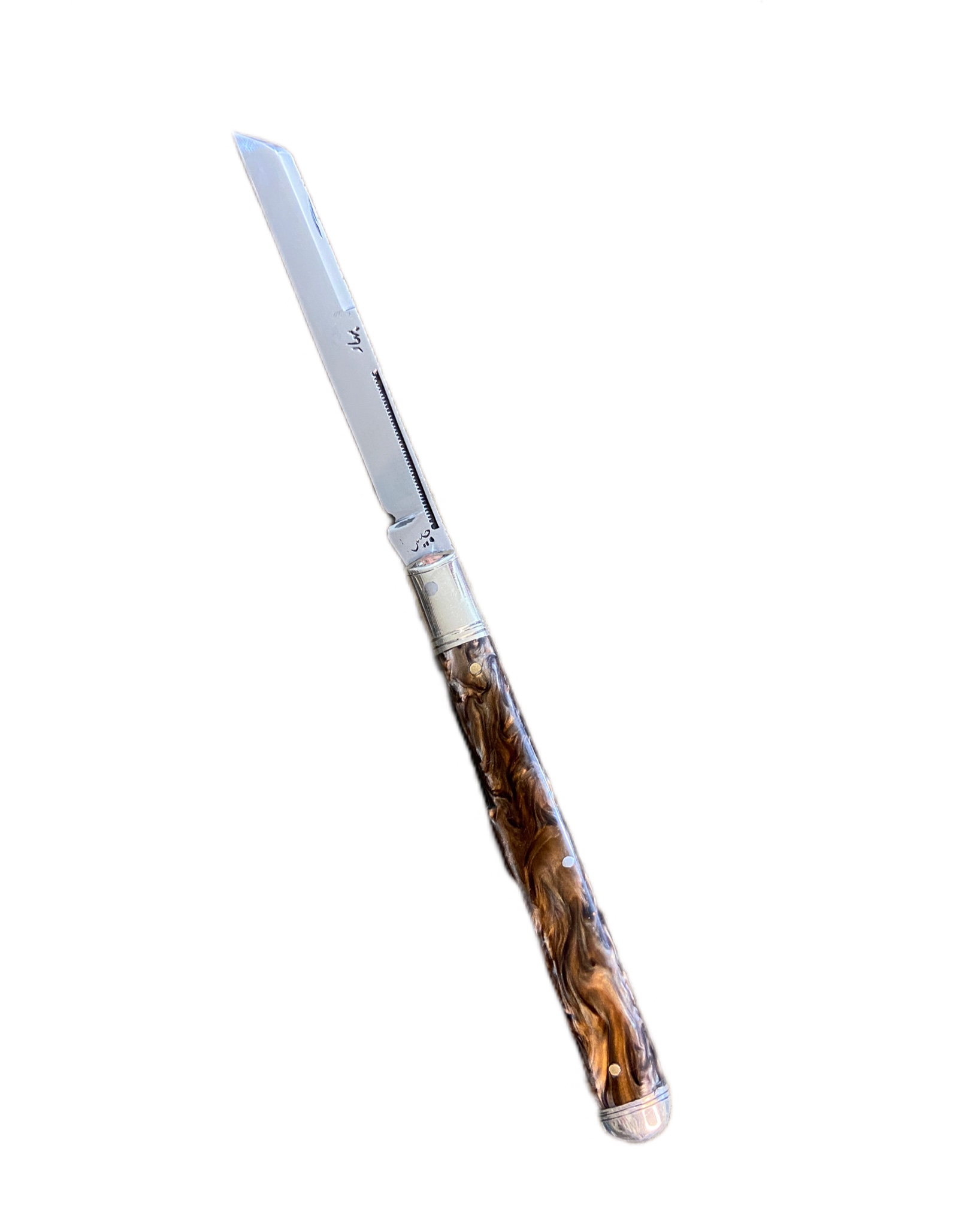 جنس تیغه این چاقو از نوع فولادی میباشد و دسته آن از جنس فیبر صدفی میباشد.